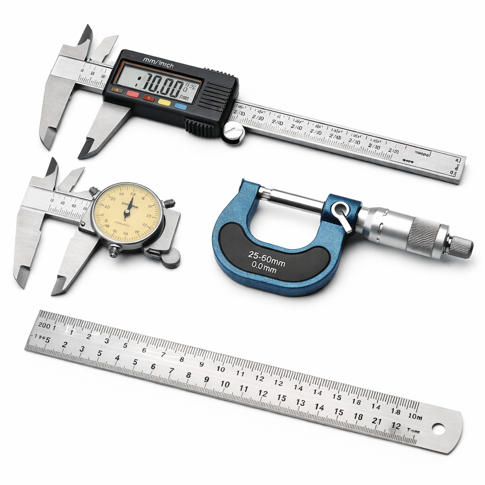 Measuring tools confirm dimensions and wear. The right tool depends on the feature you’re measuring and the tolerance you need to control.